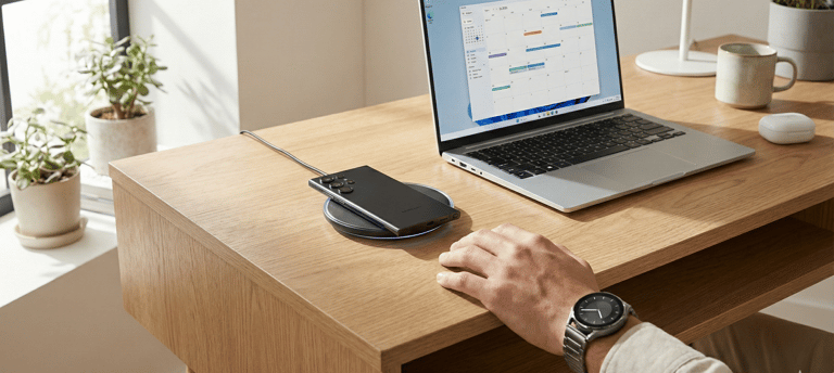 Galaxy S26 Ultra em uma mesa de trabalho com Galaxy Watch 8 e Buds3 Pro