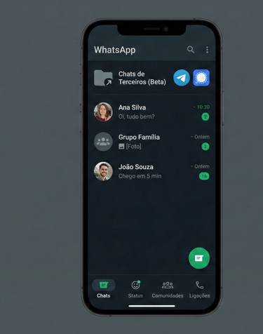 Interface "Third-Party": Nos testes atuais, as mensagens vindas de outros apps não se misturam com as conversas normais. Elas ficam isoladas em uma aba específica para evitar spam e garantir a organização.